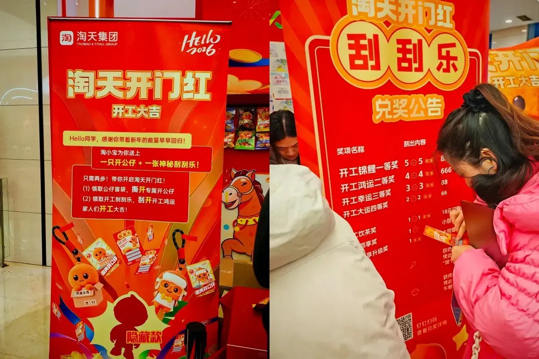 不仅能拿糖果沾喜气,还能领到开工仔盲袋和一张刮刮乐,最高可以抽到 888 的现金红包,还有奶茶券、零食自助、餐券等奖品。开工第一天的好彩头这不就有了吗!