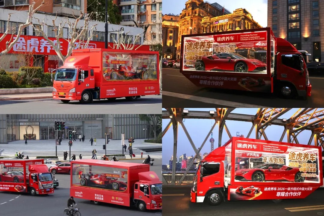 作为 F1 赛事的合作伙伴,途虎养车这次玩的是街头快闪,把“痛车”开上了上海街头,在一辆红色展示巴士车身的透明展柜里,高调摆上一台闪电红法拉利赛车,随机出现在上海各大主干道和商圈,主打一个转角遇到爱。