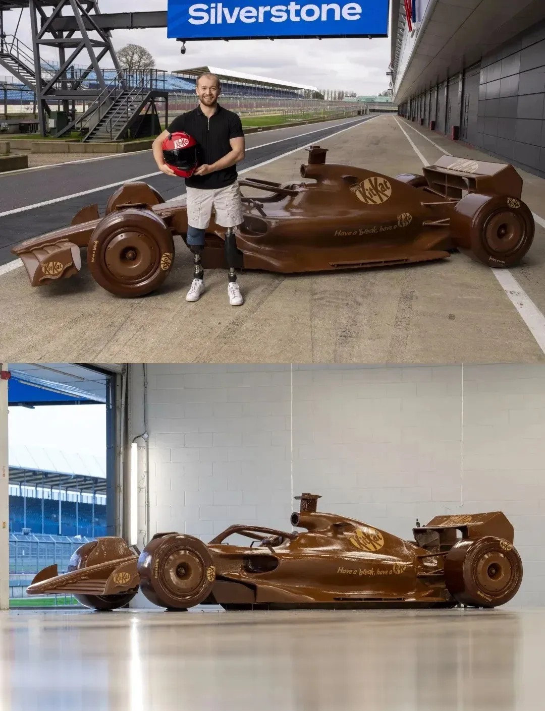 雀巢旗下品牌奇巧 KitKat,这次直接用巧克力做了一台赛车。在 F1 发源地银石赛道,展出了一辆 1:1 等比例的巧克力 F1 赛车,耗时 1254 小时制作,重达 350 公斤,车身还刻着品牌 slogan“Have a break, have a KitKat”。