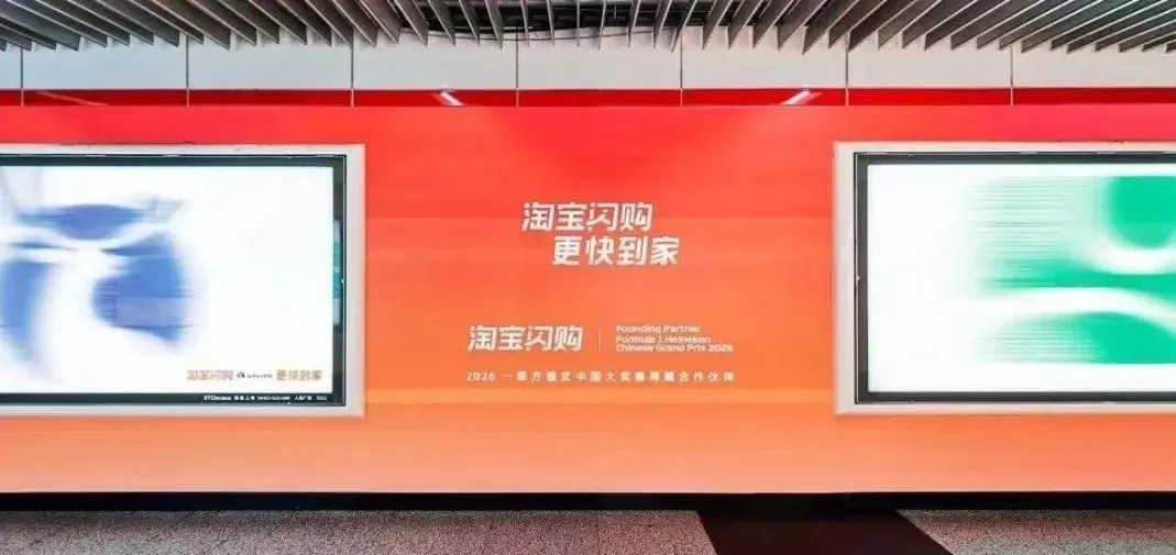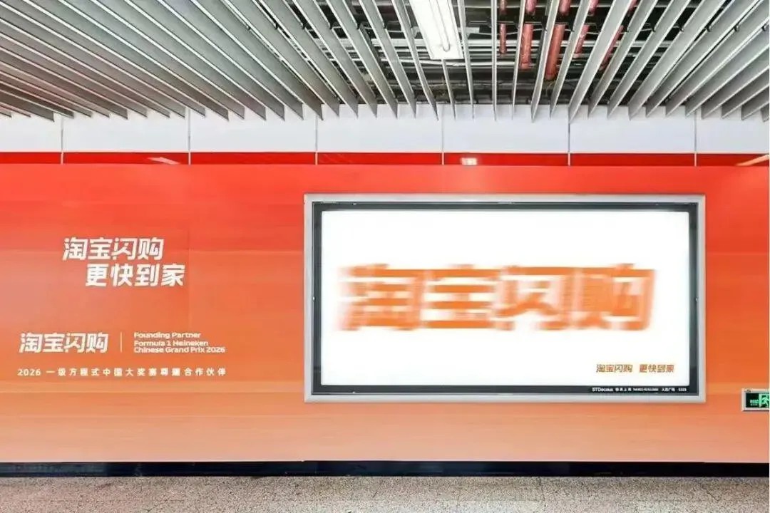 为了借势 F1 赛事热度,淘宝闪购在上海人民广场地铁站上线了一组让通勤族集体怀疑眼睛的地铁海报,主视觉只干了一件事:故意把画面做得很糊。茉莉奶白、大润发、1 点点等各大品牌的 LOGO 集体变糊,全部在极速的运动模糊中变成一片残影。