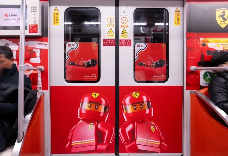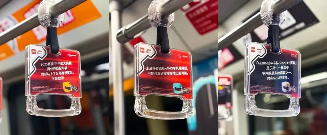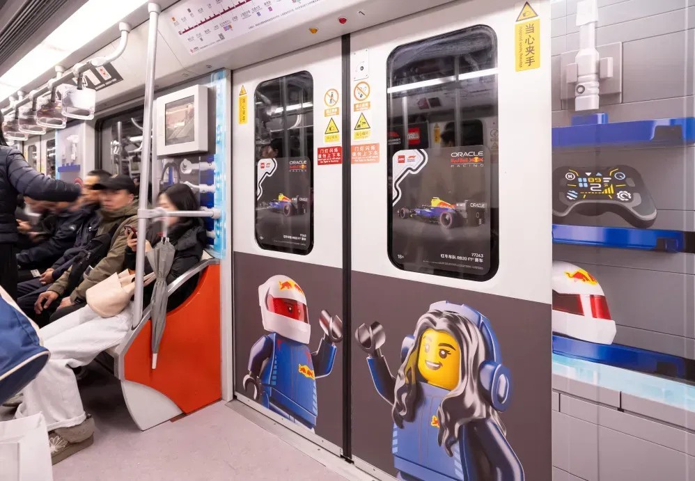 乐高还把 11 号线整列地铁变成了 F1 主题专列,吸引不少车迷们前来沉浸式打卡,车厢内部都是不一样的主题色,每节车厢对应一支车队,车门、车顶、车壁、地面到处都藏着车队小彩蛋,把赛事氛围从赛场延伸到了通勤日常。