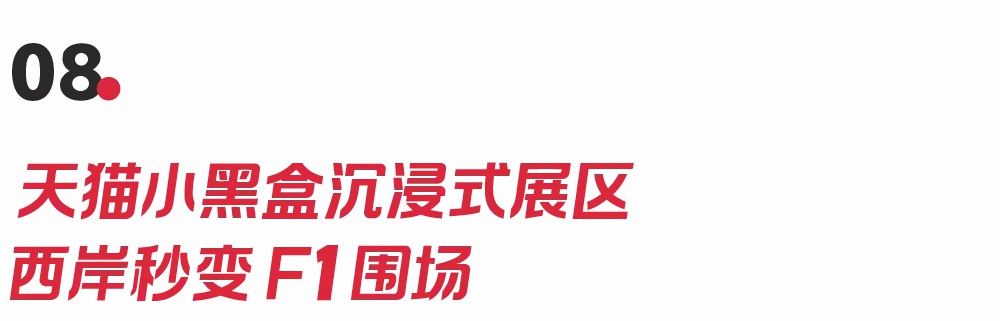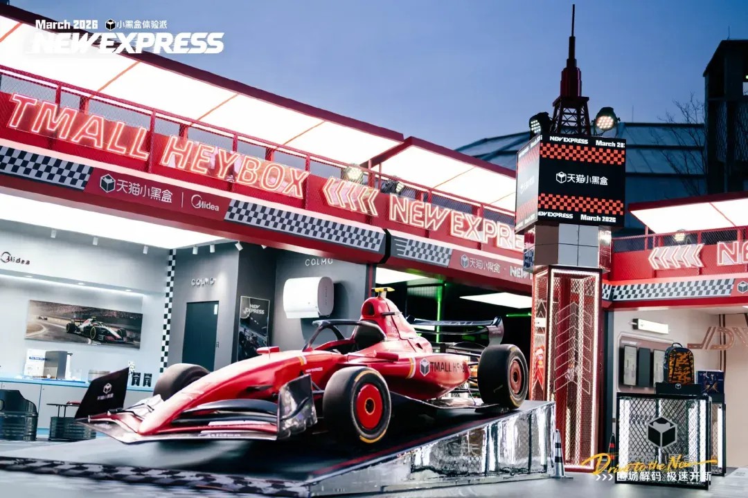 天猫小黑盒倒是直接在徐汇西岸穹顶艺术中心,搭了一个「极速体验派」沉浸式展区,把赛道体验、潮流购物、美妆科技一锅端了,还停放着一台红色的赛车模型打卡,吸引不少网友前来打卡,随手一拍就能拍出一组竞速大片。