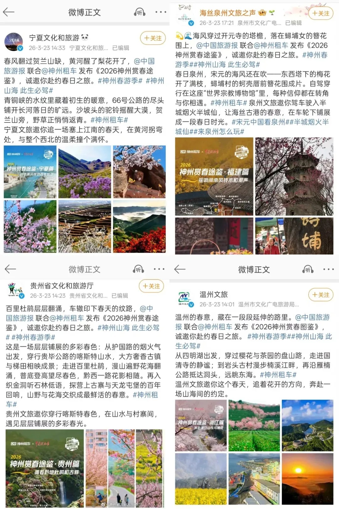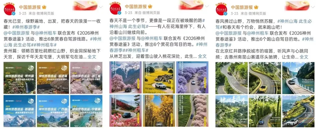 神州租车正是抓住春游这一独有的季节特征,联合《中国旅游报》及温州、西藏、四川等多地官方文旅,推出 6 条春游路书、6 个赏花目的地、6 条跑山路线,覆盖福建、广西、贵州、宁夏、新疆、浙江等多个省份,形成全国一盘棋的春日传播矩阵,每一条路线都紧扣春季景观特色,既有权威背书,又有极强的季节落地价值。