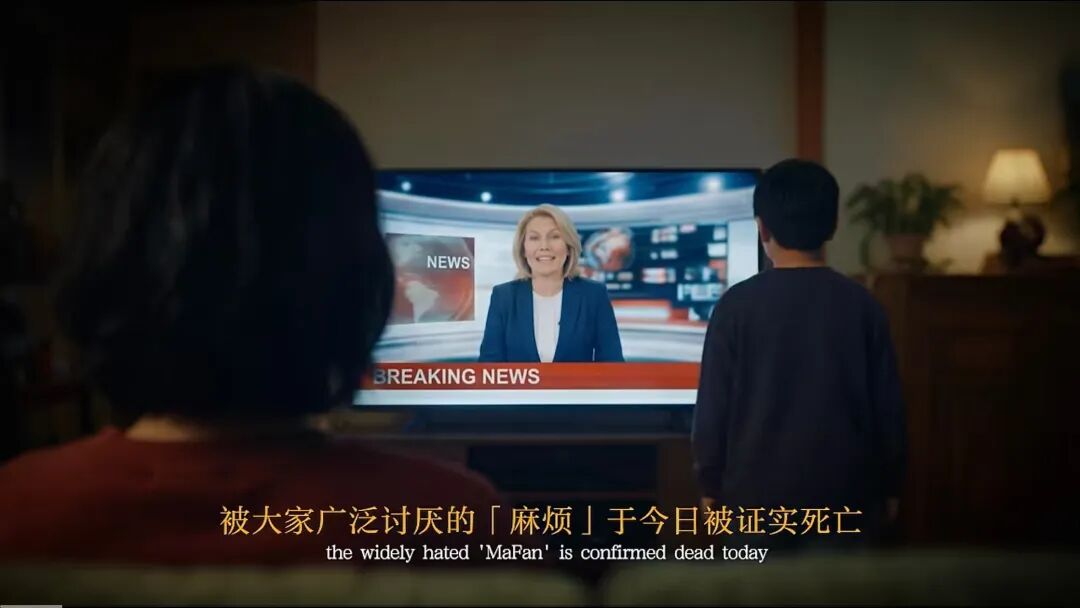 结尾还特别说明内容由 AI 制作,无真人受伤,祝大家愚人节快乐。这清奇的脑洞,把品牌信息完美融入愚人节的玩笑里,看完只想许个愿:既然“麻烦死了”,那能不能顺便把“穷死了”和“累死了”也一并带走啊!
