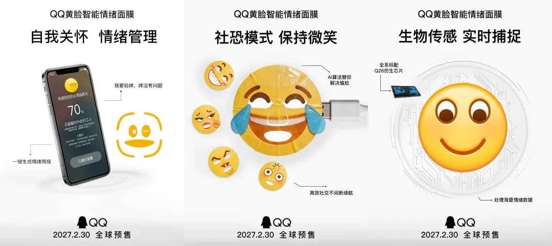 震撼首发,QQ 杀进了“科技护肤圈”,重磅发布「2027SS QQ 黄脸智能面膜系列」YellowFace Pro,给全网网友整得一愣一愣的。