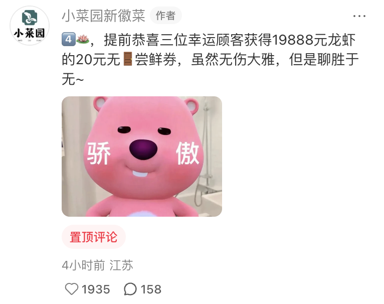小菜园官方似乎还很骄傲这次的改名方案,还抽起了 19888 元龙虾的 20 元券,一本正经地自我调侃“虽然无伤大雅,但是聊胜于无”。怎的?抽中这个和抽中一张劳斯莱斯的五元代金券有何区别?