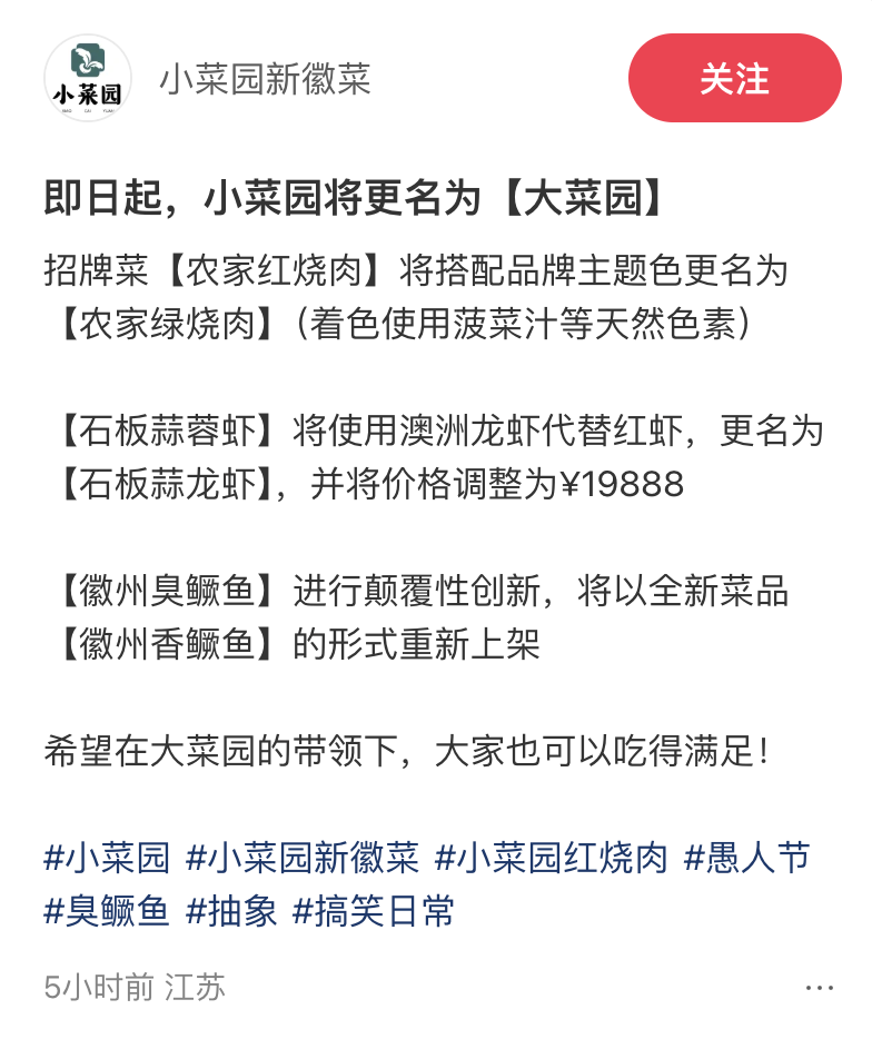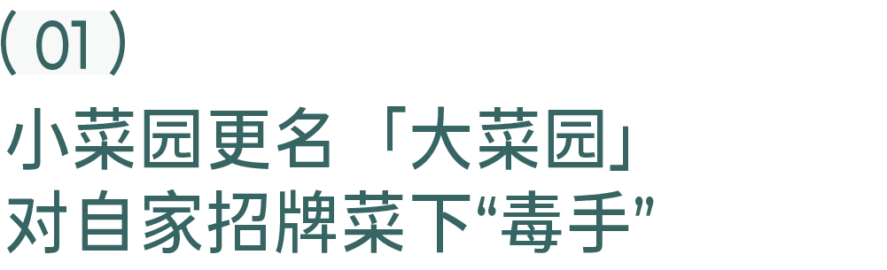 小菜园直接把自家名字给换了,宣布即日起更名为「大菜园」,属实是把做大做强的野心写在脑门上了。不光是光速改名字,甚至还对自家赖以生存的镇店招牌菜下了“毒手”。要不是知道今天是愚人节,还以为小菜园不想干了。