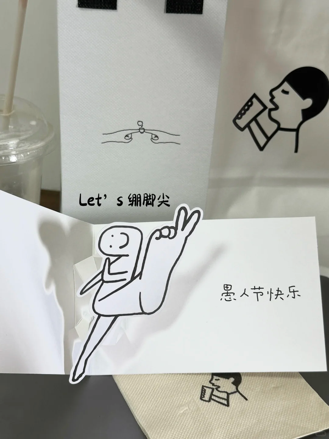 用手可可爱爱地比个 V,结果被喜茶的灵魂画手爆改成了极其荒诞的伸出脚比耶。当你毫无防备地翻开小卡的瞬间,一只骨骼清奇的脚丫子弹射出来比了个耶,祝你愚人节快乐。