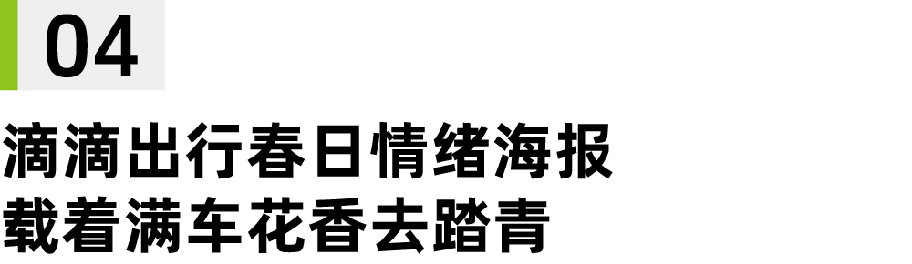 从线上到线下,滴滴出行这一系列动作让品牌自然而然地融入到了大家春游的具体场景里,不露痕迹地提升了大众好感度,开启春日好心情。