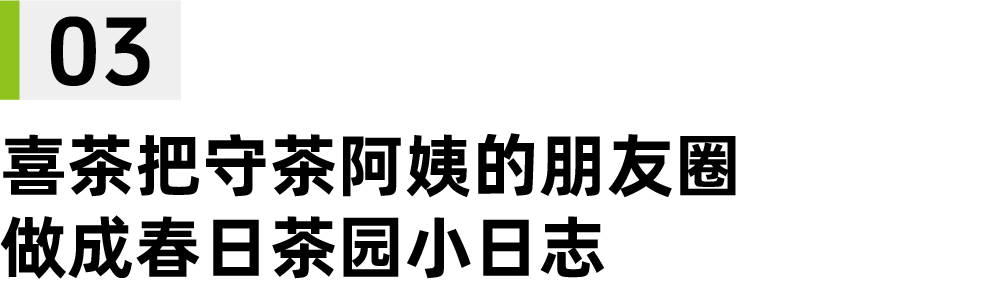 阿姨用朋友圈记录着茶园日常:春天忙着采茶忙到沾枕即睡,偶尔端着饭碗在茶园里散步,还会盼着采茶季结束能好好放假。这些日常就这样被喜茶整理成了一本小小的茶园日志,设计得特别有温度,手写体文字搭配茶园实景与简笔手绘,像随手翻开的邻家日记。