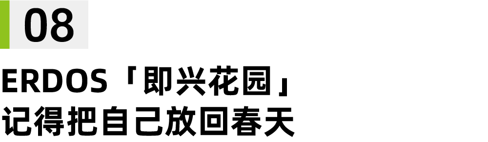 五位赏花人观看、触摸、聆听、细嗅,在花园里、在自然里感受生命本真。ERDOS 把品牌的松弛、自然、自在内核,和当代人渴望逃离紧绷、回归本真的需求结合,在这个轻松舒缓的春日鼓励大家把自己放回春天,即兴⽽为,尽兴⽣⻓。