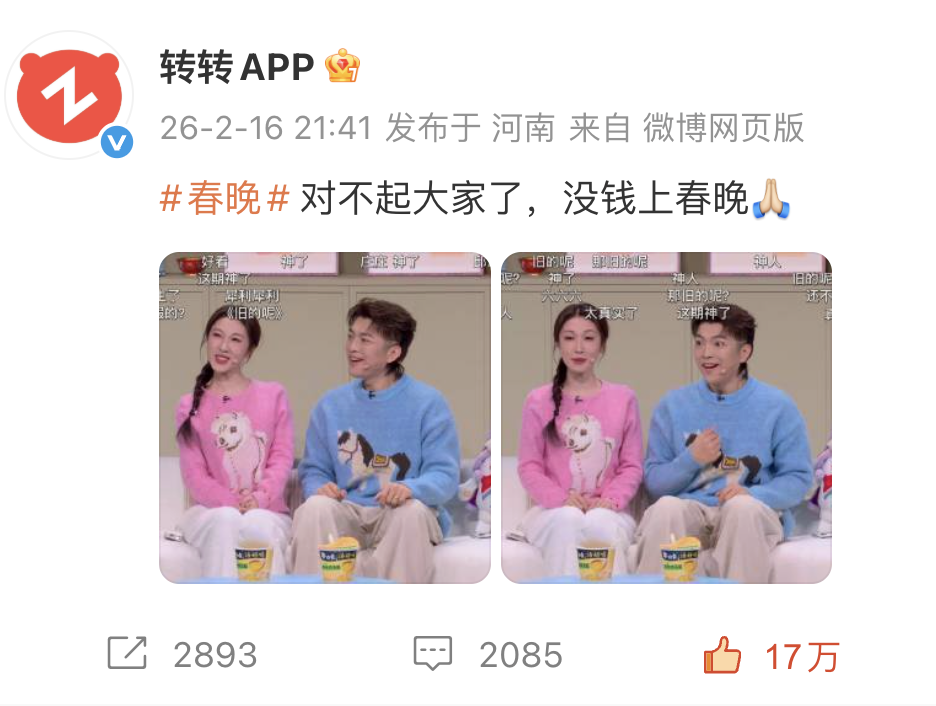 人在家中坐,流量天上来,转转官方也是展现出了冲浪十级选手的素养,面对网友们的热议“自黑”回应:“对不起大家了,没钱上春晚。”
