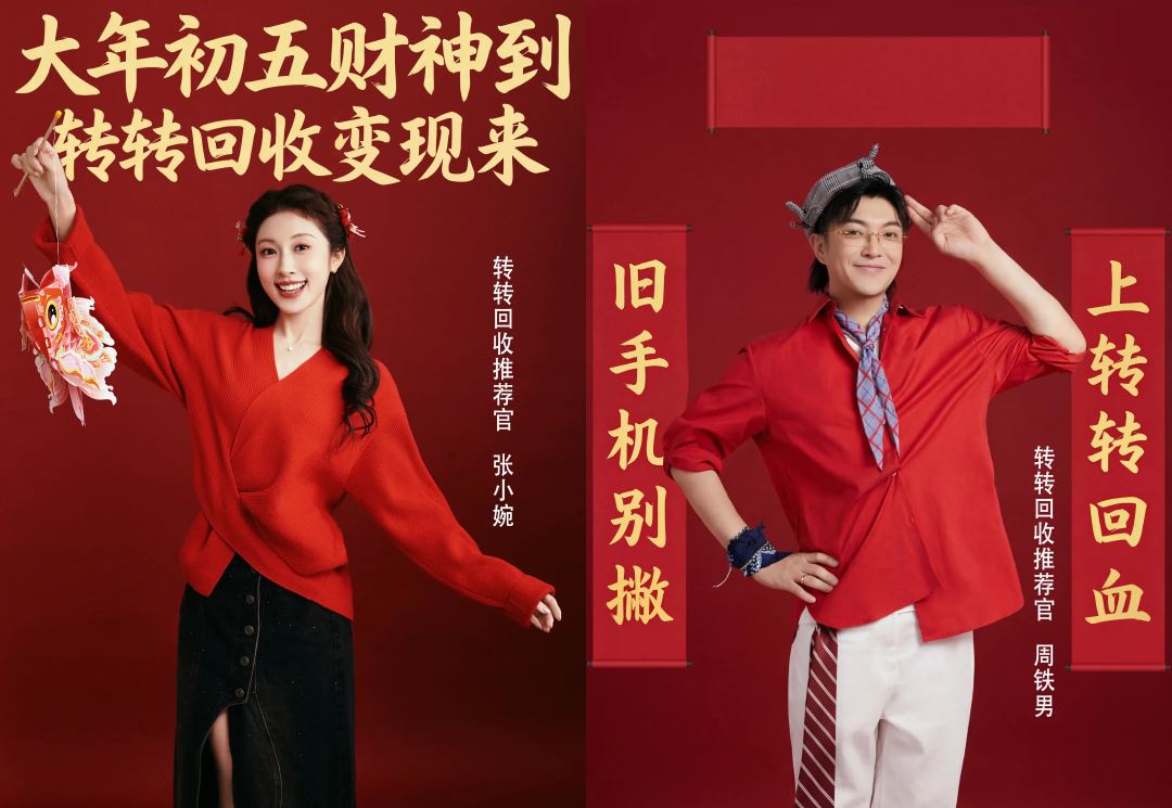 转转不仅是 8G 冲浪,更是雷厉风行,大年初五的时候,就已经率先一步接上梗了,官宣小婉和铁男成为品牌回收推荐官,海报正面回应了小品里的梗“旧手机别撇,上转转回血”,横批还交给网友们造梗互动。