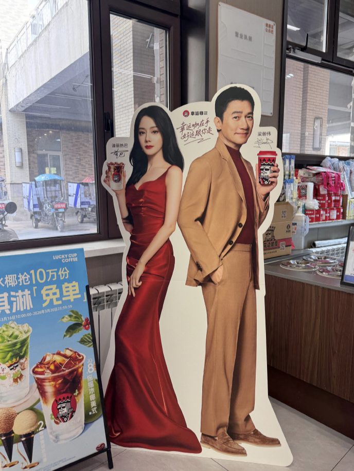 这次合作两人有着清晰的定位分工:迪丽热巴是幸运咖臻选咖啡全球代言人,梁朝伟则是幸运咖品牌代言人。两人的立牌往那一站,高级到还以为在戛纳电影节红毯上。