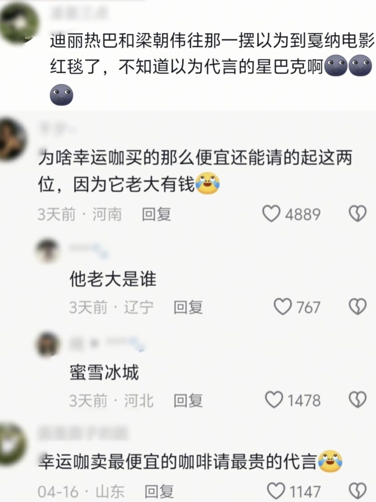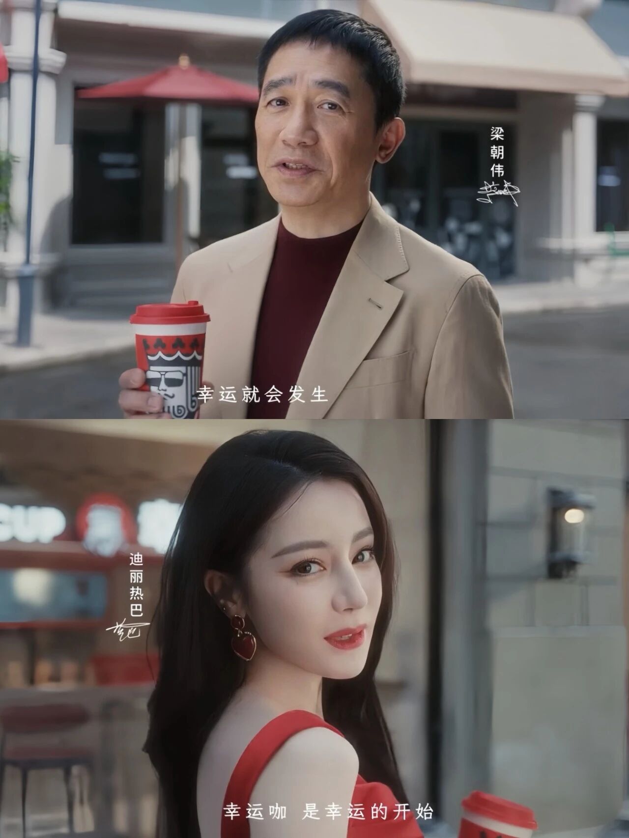 4 月 19 日,一直闷声做咖啡的幸运咖突然官宣梁朝伟和迪丽热巴双代言!