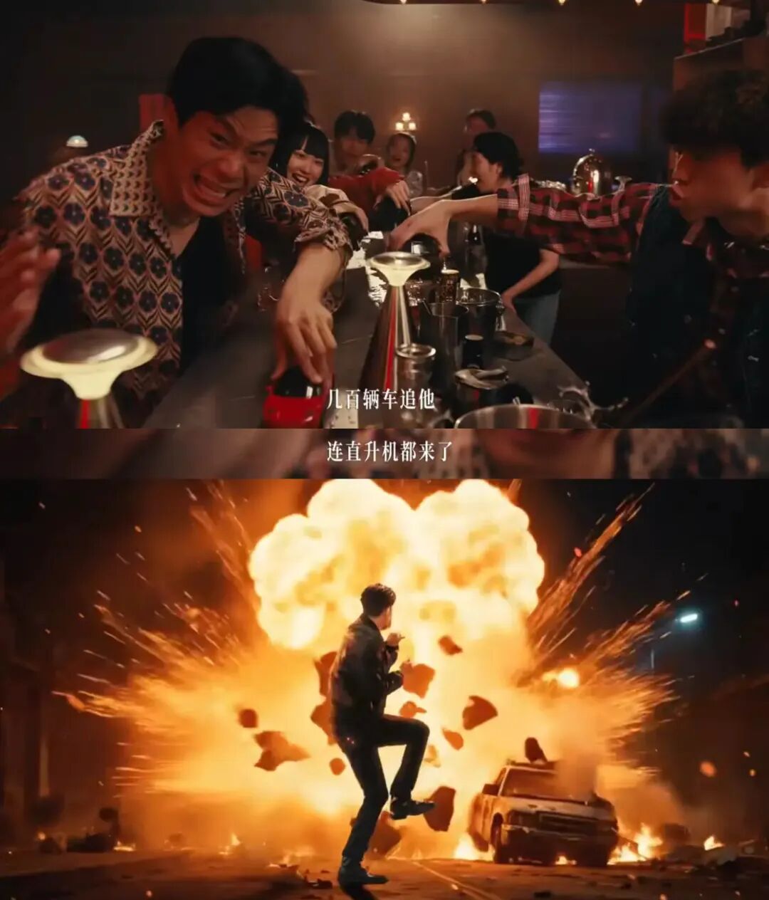 氛围稍被打破就会冷不丁梆梆再被拉回来,直到最后还出动了上百辆车和飞机,堪称动作大片的精彩追逐镜头配置,搭配着恰到好处的爆炸和肖战老师的留头美学处理,悬疑氛围又一次被层层叠叠的铺垫推上了高潮。
