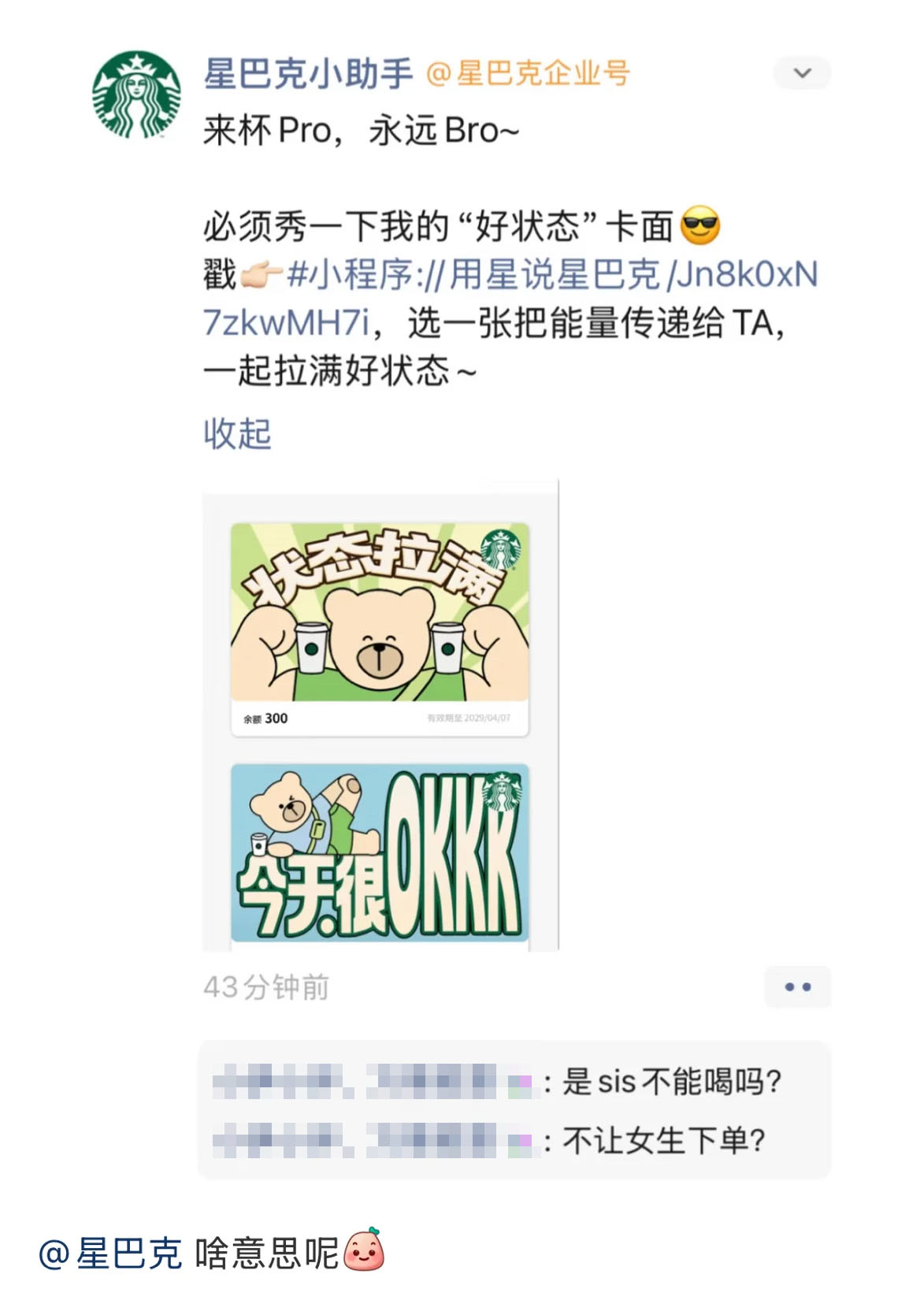 随后有消费者发现,星巴克在微信平台的宣传内容中同样着重使用了“Bro”一词。