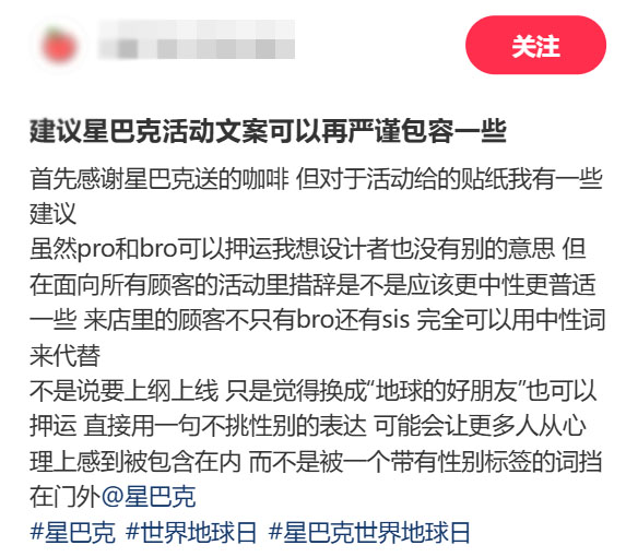 就在大家以为又是常规操作的一年,星巴克却陷入谐音梗翻车的争议中,其中一款杯贴“喝星巴克PRO,你是地球的好 BRO”被指有非常明显的挑衅意味。在当下的网络语境中,“bro”通常特指男性,且带有不够友善的色彩,因此不少人质疑该文案过于侧重男性消费者,对女性顾客缺乏尊重。