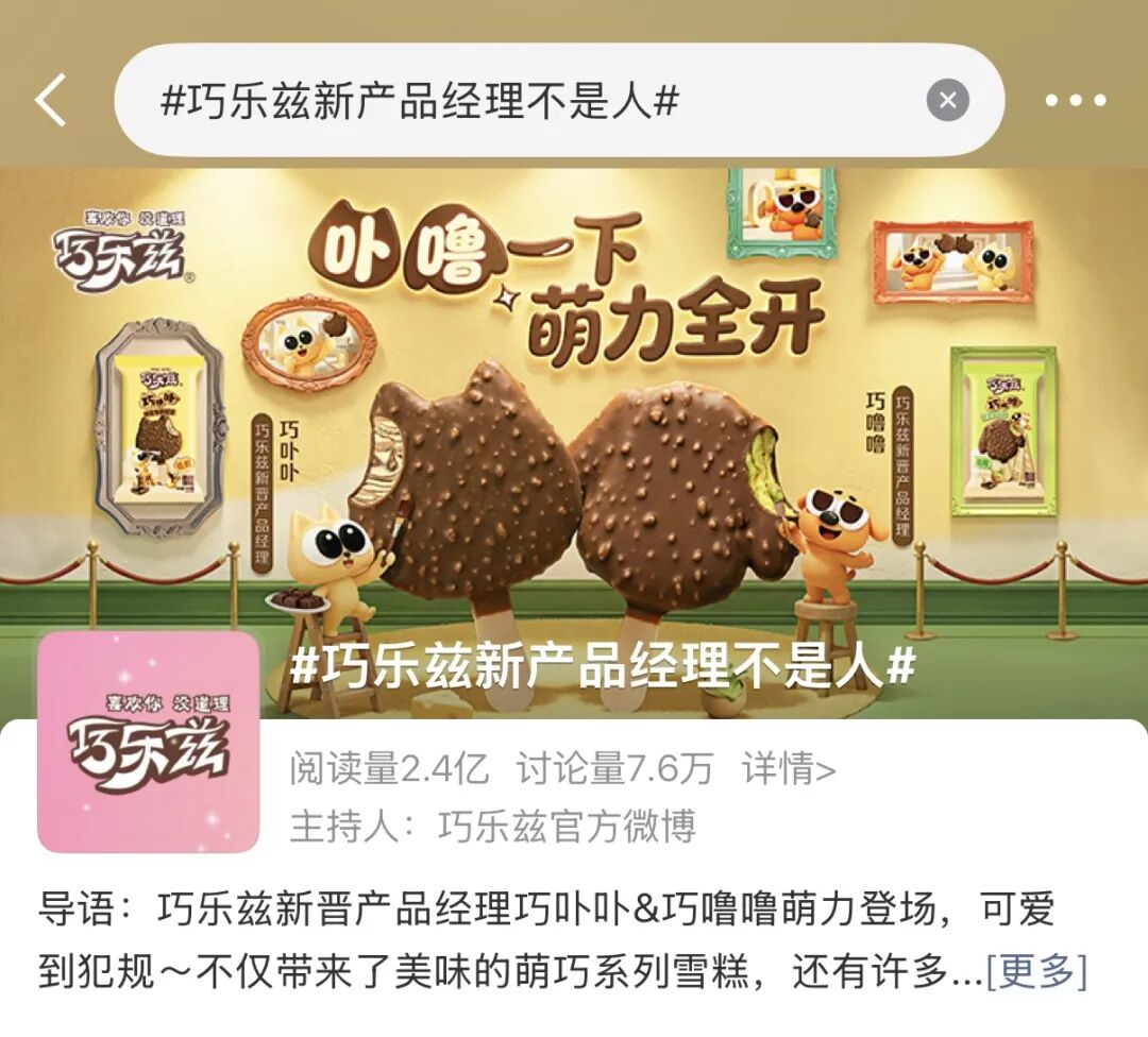 前段时间,“巧乐兹新产品经理不是人”上了热搜,点开一看,果然不是“人”,是可爱的巧卟卟和巧噜噜。能把咸酪布朗尼和抹茶可可玩出猫狗萌系造型,还搞个低糖配方,这懂年轻人的程度,确实超乎想象。
