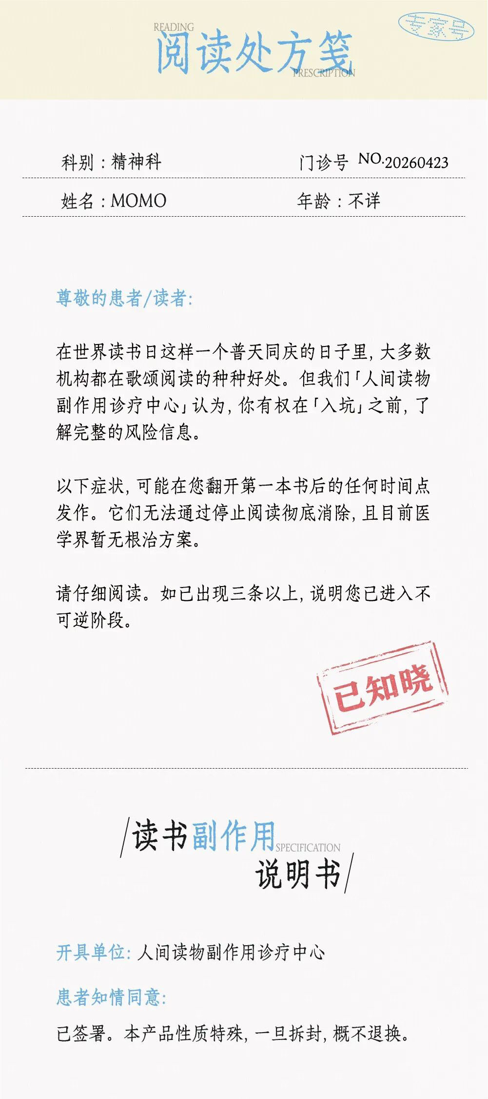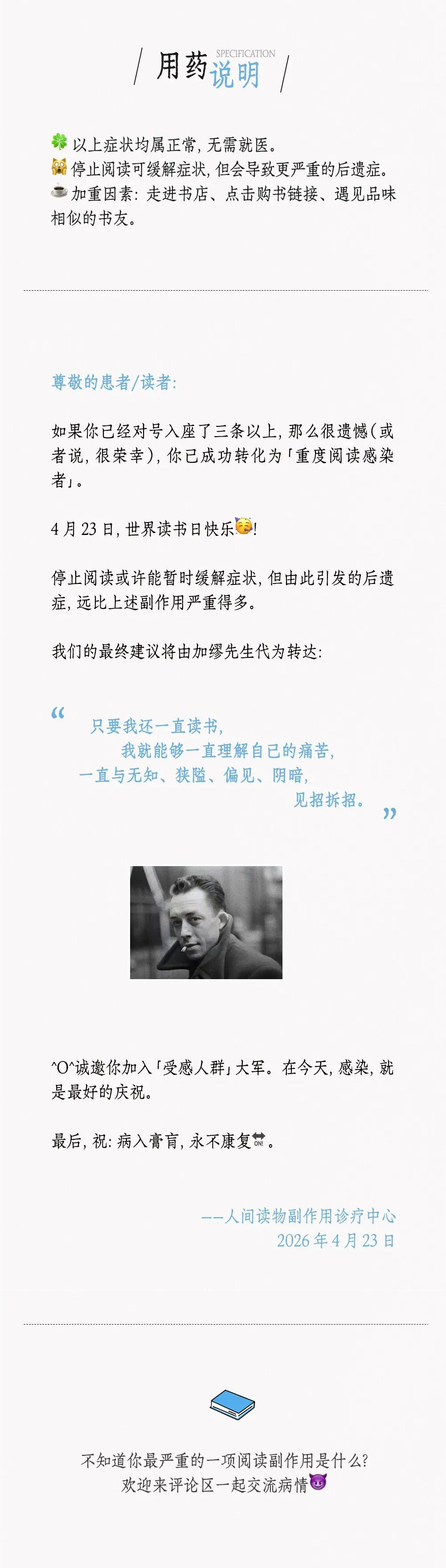 世界读书日:这是一份“阅读副作用说明书” 2小时前 条漫 节日 0 评论已关闭 6 转载原创文章请注明,转载自: 创意广告 - 世界读书日:这是一份“阅读副作用说明书” (https://www.creativead.com.cn/archives/13519) 0 分享到:
