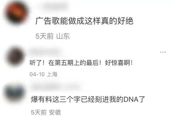 把“爆有料”变成一首爆上头的歌,简直是打通了听觉洗脑的任督二脉,网友也为之惊讶:“广告歌能做成这样真的好绝!”