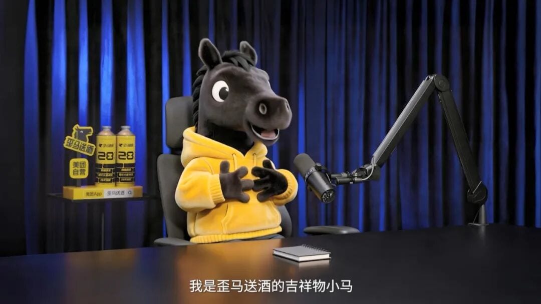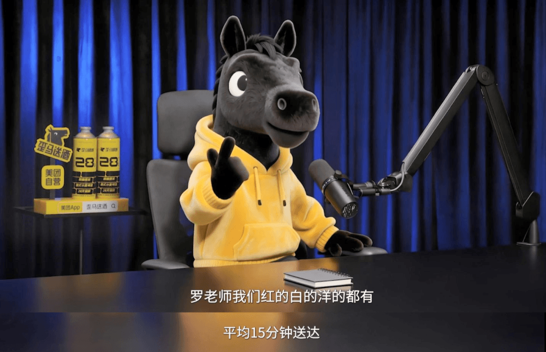 我们都知道,脱口秀的艺术在于冒犯,这支广告的精髓也有点儿“冒犯艺术”,美团歪马送酒借这只腹黑搞怪小马,问了三个在真实采访中绝对不会问的问题:最不真诚的嘉宾、像警察审犯人、播客为什么不了了之,这种“冒犯”因为来自一只不存在的 AI 生物而被合理化。
