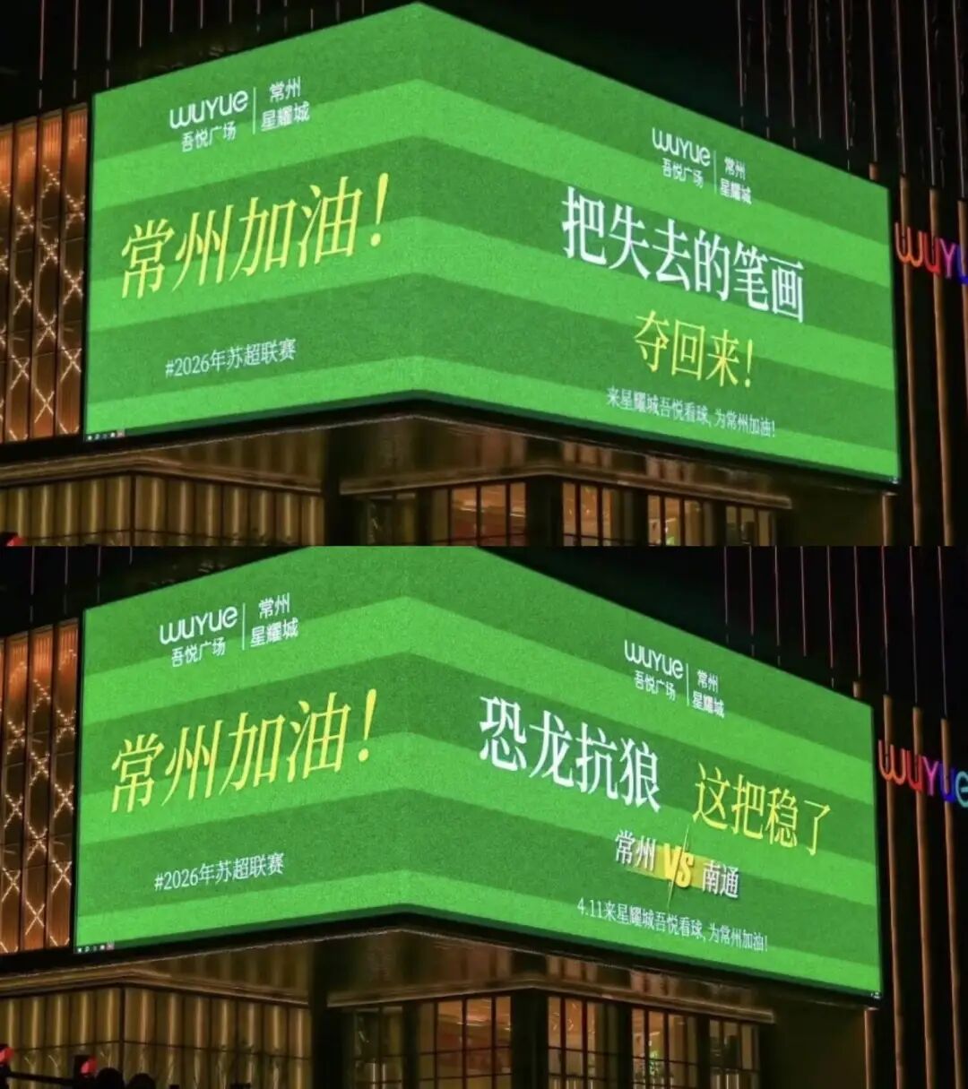 今年苏超的揭幕战,迎来了常州对阵南通。去年南通队的战绩可查,而常州队嘛,也是“很容小觑”的。这次揭幕战的 PK,也是被网友辣评“最软的盾对上最硬的矛”。于是南京华贸新天地的大屏文案随机气晕一个常州人:“常垫底 vs 很南输”“常州的球门很南通过”。