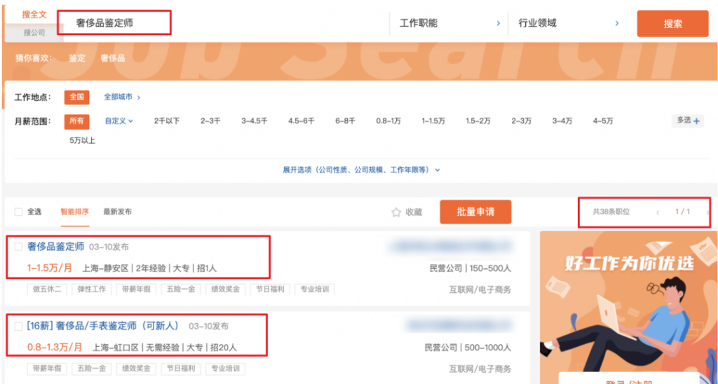 至于做奢侈品鉴定师会不会“年入百万”,头条君只能说:九分忽悠一分真。 为什么说是“九分忽悠”呢? 在某招聘软件上搜索“奢侈品鉴定师”职位,只跳出了一页内容不说(准确说是38个职位),月薪也都在1w-5w之间,高于5w搜出来是一片空白。