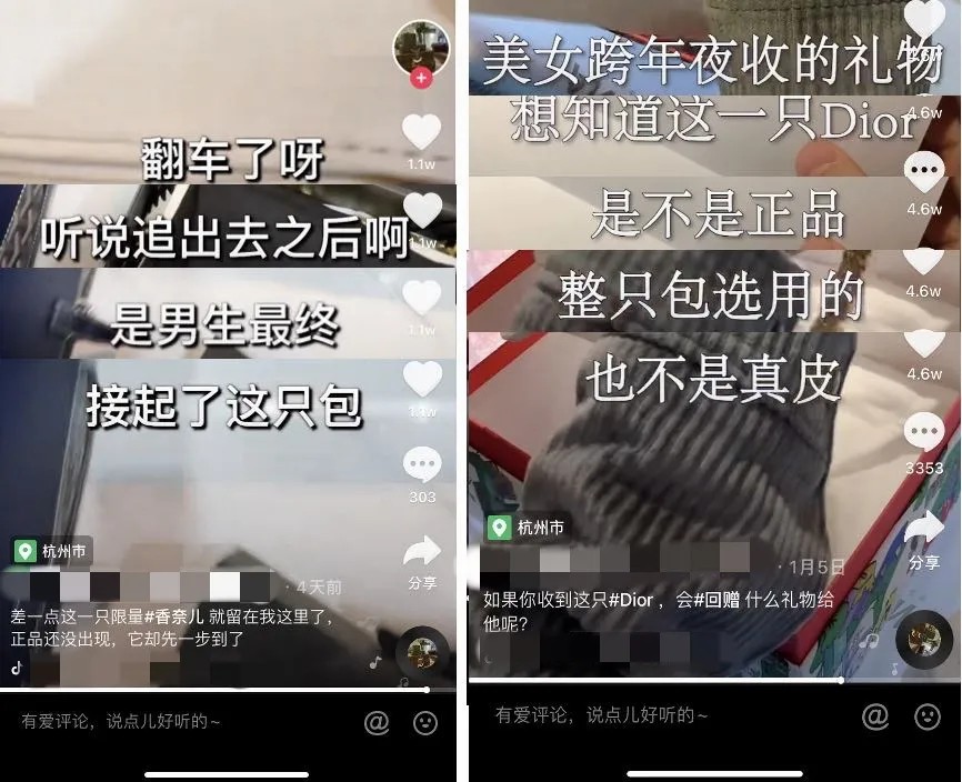 至于小视频的脚本套路,跟大家经常在微博上看到的“土味领券”广告有的一拼。 如果说“土味领券”广告的剧情流程是:渣男劈腿-闺蜜安慰-打开手机(锁屏为流量爱豆)-教大家领券-猝不及防惊艳渣男。 那“奢侈品鉴定师”们惯用的人物设定就是:女生拿男朋友送的包做鉴定-鉴定师眉头紧缩-告诉女生“这包有问题”-女生打电话/当面质问-分手。