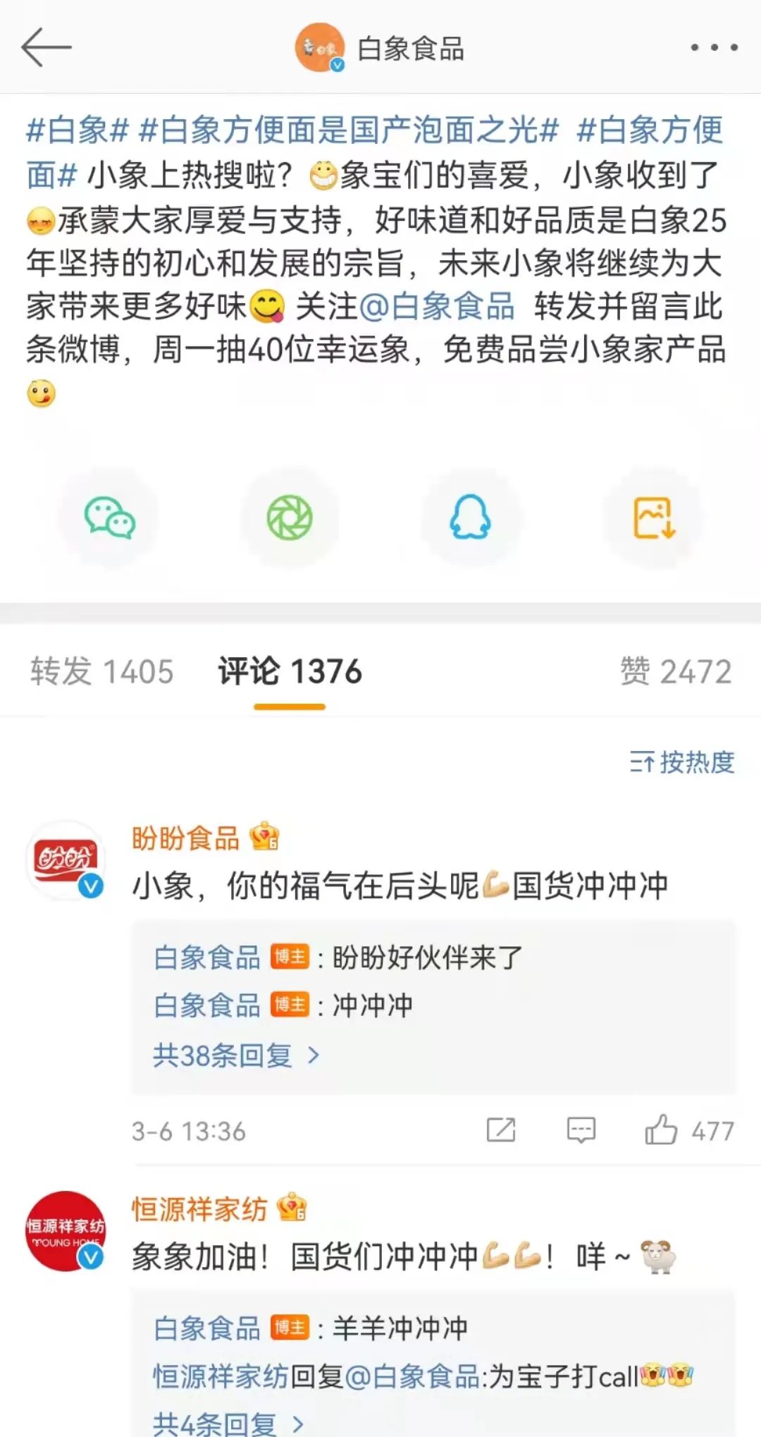 后续的白象也带tag蹭了波热点,其他同样是国货的品牌官博纷纷赶来评论区吸吸喜气: