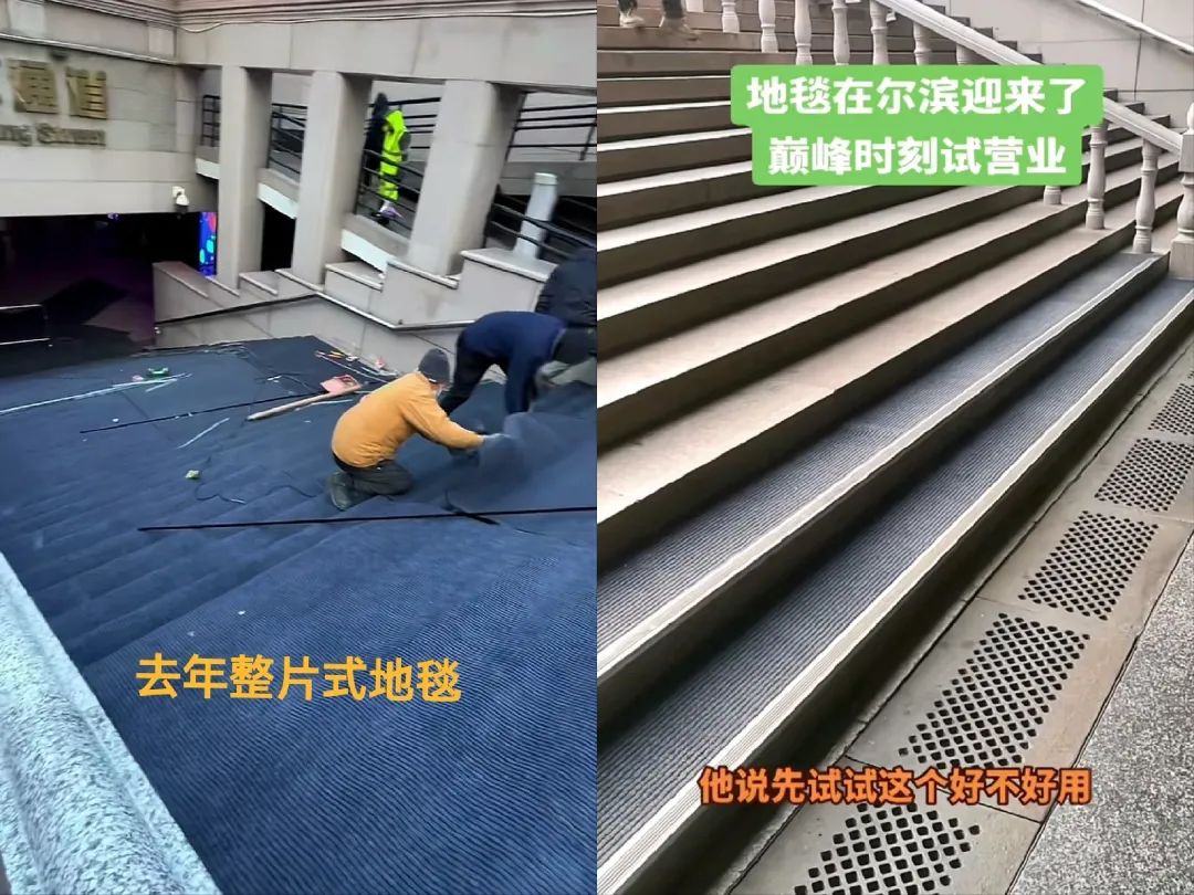 哈尔滨一下点雪就开始“媚南”。去年,为了防止路过的南方小土豆们滑倒,尔滨在中央大街的人行通道楼梯铺设了一整张大地毯,而今年,尔滨更新升级了,打算一阶一阶地铺上地毯并加固铁角,先铺两块试试效果。