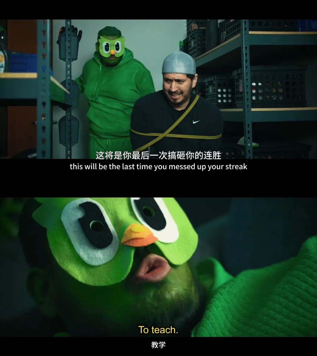 不难发现,在劝学这条路上多邻国用尽了心思,每年都会出各式各样的“绑架”视频,来稳固其邪恶统治地位。