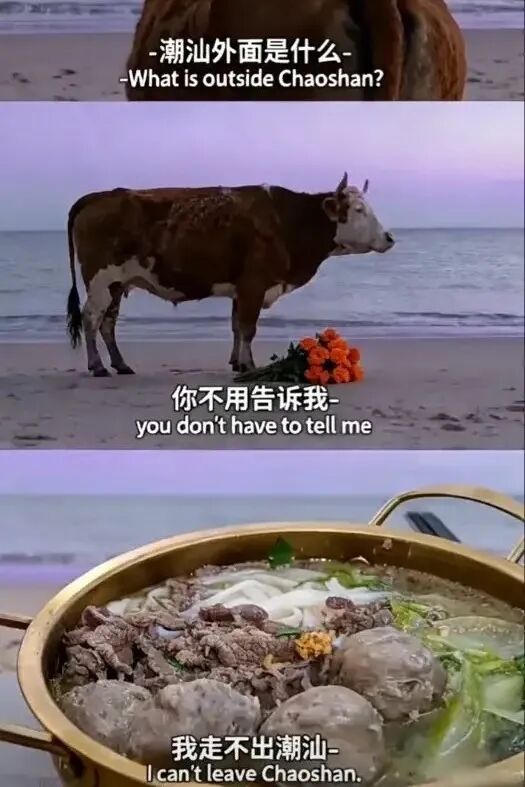 各地文旅的野生代言人实力一直可以的,你可以永远相信网友的脑洞和创意。从动物系列引申到自家美食,大家的 P 图天赋已异于常人。在潮汕,对鸭鸭来说,你问它潮汕外面是什么?不用告诉它,因为它走不出潮汕。