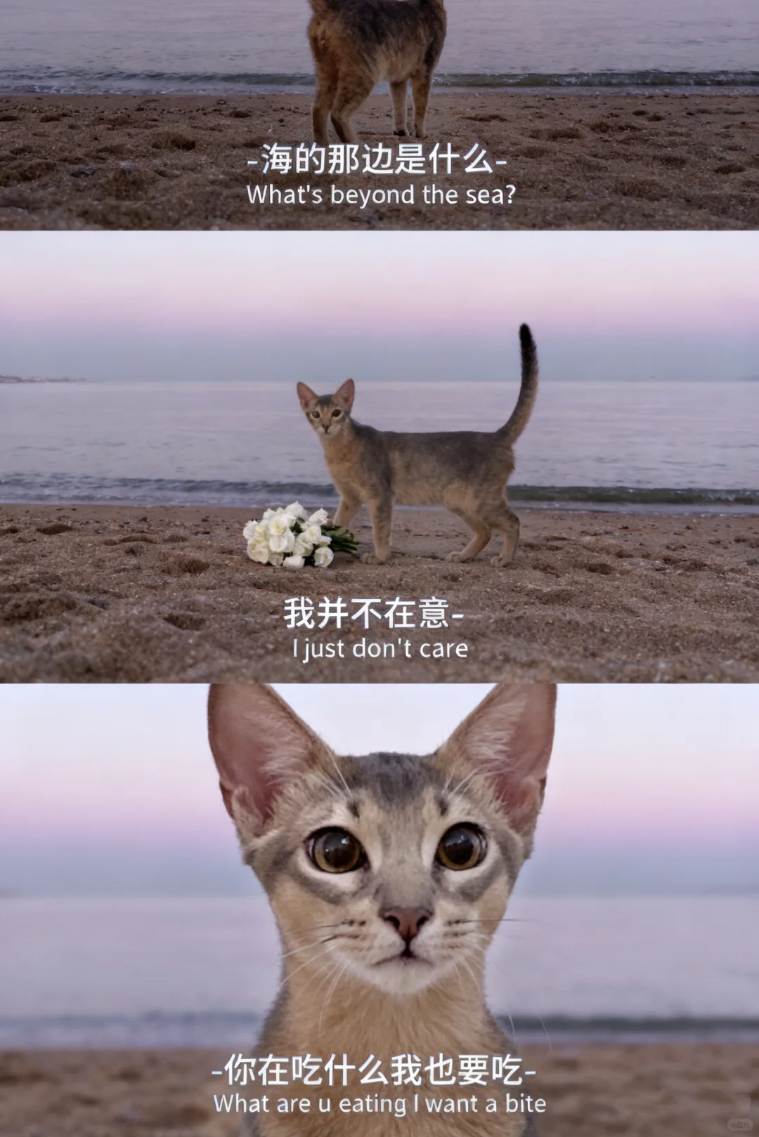 只需要对豆包输入特定的指令并上传特定照片,就能得到一张电影胶片质感的海边三宫格氛围感拼图:从上至下近景、中景和大特写的切片,再配上中英文电影感字幕:「海的那边是什么,你不用告诉我,我自己会去看」,探索世界和远行冒险的澎湃精神内核搭配上清新忧郁的海滩背景,小氛围感一下子就上来了。